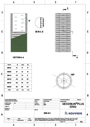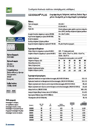 Ο νέας γενιάς 4-στρωματικός σωλήνας αποστράγγισης GEODRAIN PLUS με ενσωματωμένο γεωύφασμα παράγεται σε κουλούρες των 50m και 25m με ακαμψία δακτυλίου SN4. Είναι διπλού δομημένου τοιχώματος και είναι συμμετρικά διάτρητος στις 3600. Το 1ο στρώμα αποτελεί η λεία εσωτερική του επιφάνεια που εξυπηρετεί την ομαλή διέλευση των υδάτων ενώ το 2ο στρώμα αποτελεί η δακτυλιοειδής εξωτερική του επιφάνεια που προσφέρει ευκαμψία και υψηλή μηχανική αντοχή. Το 3ο στρώμα αποτελείται από 4 διαμήκεις μπλε γραμμές για την χρωματική σήμανση των υδάτων. Η σειρά των σωλήνων GEODRAIN PLUS προσφέρεται με προ-εγκατεστημένο γεωύφασμα 150gr/m², μη υφαντό και βελονωτό που αποτελεί και το 4ο στρώμα του σωλήνα.