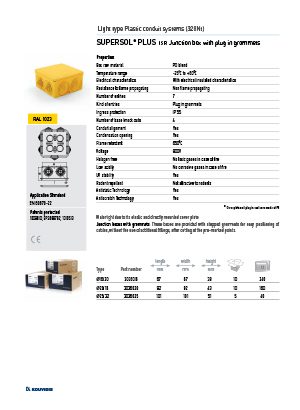 Το SUPERSOL PLUS στεγανό κουτί διακλάδωσης με αποσπώμενες βαθμιδωτές τάπες αποτελεί μέρος του συστήματος 3στρωματικών σωλήνων SUPERSOL PLUS – SUPERFLEX PLUS. Παράγεται από ειδικά σταθεροποιημένο θερμοπλαστικό PO blend σε κίτρινο χρώμα RAL 1023.